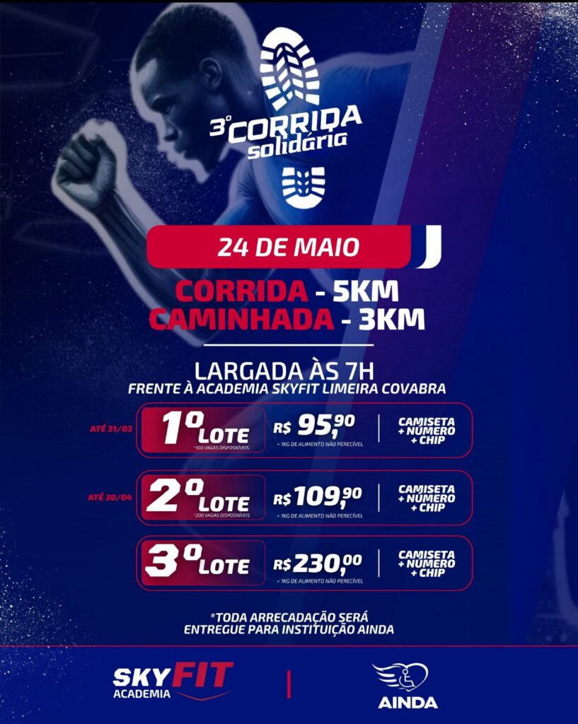 A 3º edição da Corrida Solidária Skyfit By Ainda será no dia 24 de maio de 2026 às 07:00 em Limeira, terá as modalidades: Corrida 5km e Caminhada 3Km.