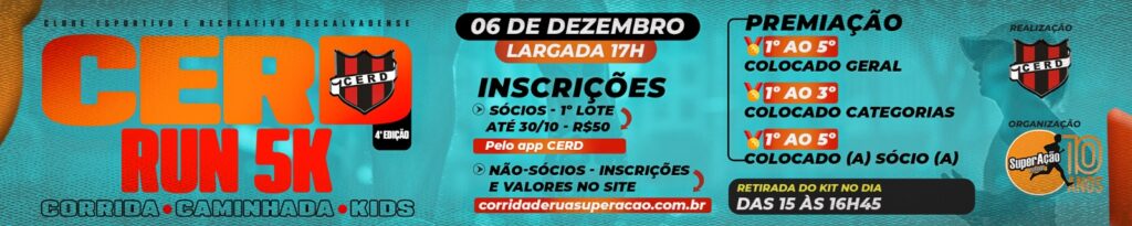A 4º edição da Corrida Cerd Run acontecerá no dia 06 de dezembro Às 17:00 em Descalvado, terá a distância de 5km de Corrida e Caminhada e Corrida Kids.