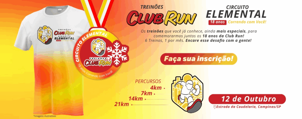 O Treinão Circuito Elemental organizado pela ClubRun Assessoria Esportiva acontecerá no dia 12 de outubro, a Etapa Neve será no Jardim Nova Europa em Campinas, terá as modalidades de caminhada 4km e corrida 7km, 14km e 21km, com início a partir das 6h15.