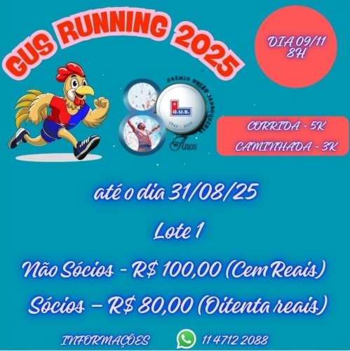 A Corrida e Caminhada Gus Running será realizada no dia 09 de novembro às 08:00 em São Roque, terá a distância de 5km para Corrida e 3km para Caminhada.