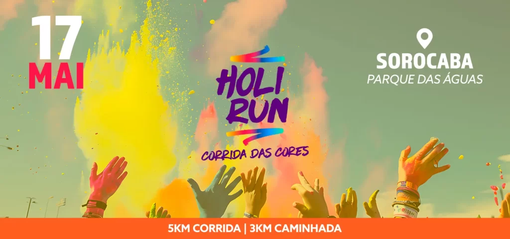 A Corrida Holi Run será no dia 17 de maio de 2026 às 07:00 no Parque das Águas em Sorocaba, terá a distância de 5km para Corrida e 3km para Caminhada.