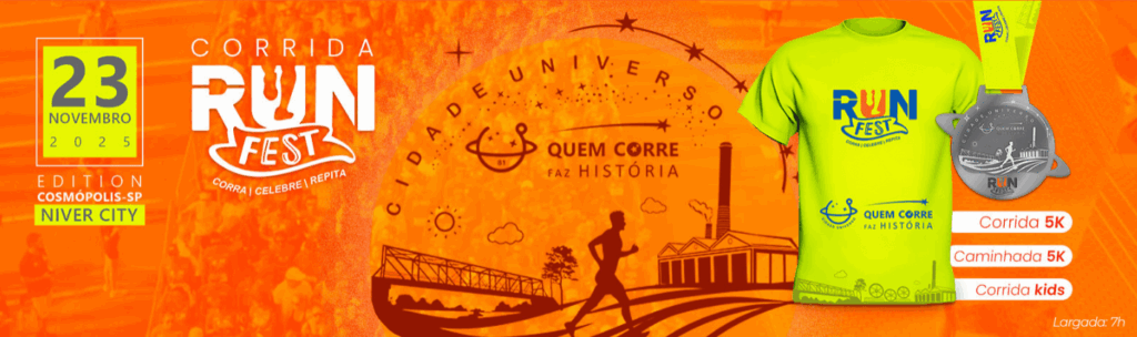 Dia 23 de novembro de 2025 acontece na cidade de Cosmópolis a Corrida Run Fest edição de aniversário do município.