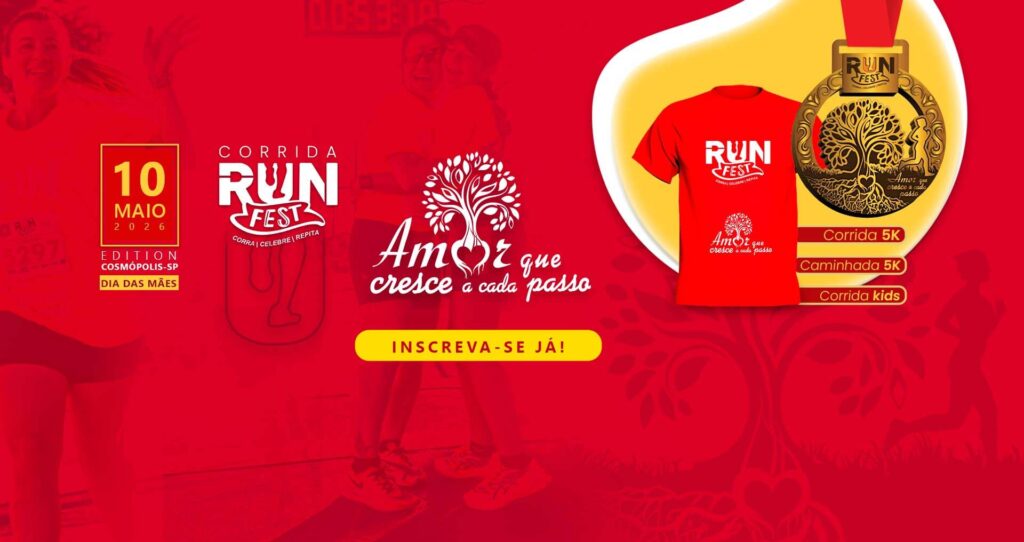 A Corrida Run Fest ocorrerá na cidade de Cosmópolis, uma celebração especial para homenagear todas as mães, dia 10 de maio de 2026 às 07:00, com a opção de Corrida e Caminhada 5k, e também Corrida Kids.