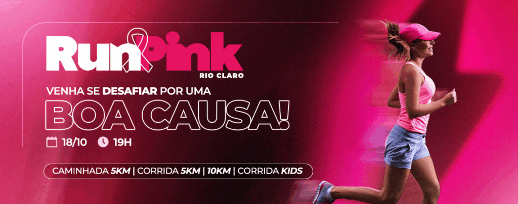 A Corrida Run Pink será um movimento de conscientização e solidariedade, acontecerá no dia 18 de outubro de 2025 às 19:00 em Rio Claro, terá as modalidades de Corrida 5km e 10km, Caminhada e Corrida Kids.