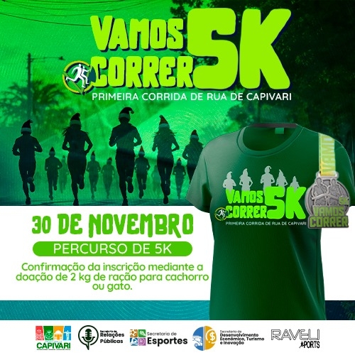 A Corrida de Rua em Capivari será no dia 30 de novembro às 07:00 na Praça Central e terá a distância de 5km.